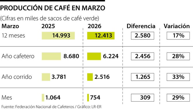 «Marzo, con 754.000 sacos, no corrigió la tendencia, sino que la consolidó, evidenciando que no se trata de un ajuste puntual, sino de una realidad productiva más retadora en el arranque del año», dijo Bahamón.